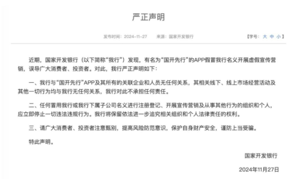 ??詳情:近期,有名為“國(guó)開(kāi)先行”的APP假冒國(guó)家開(kāi)發(fā)銀行名義開(kāi)展虛假宣傳營(yíng)銷,誤導(dǎo)廣大消費(fèi)者、投資者。對(duì)此,國(guó)家開(kāi)發(fā)銀行于11月27日在官網(wǎng)發(fā)布《嚴(yán)正聲明》: