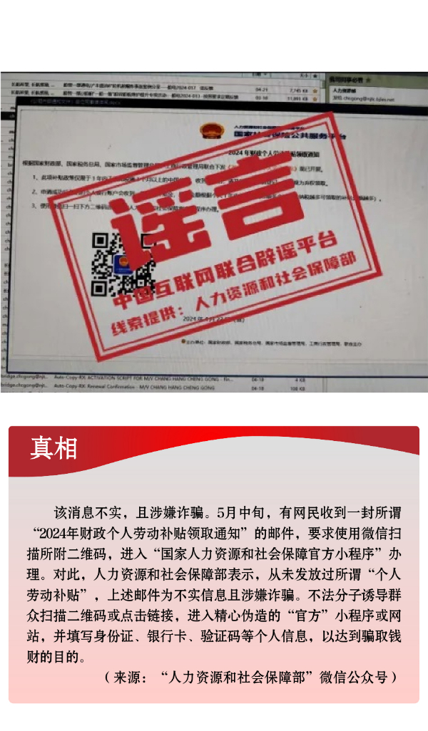 ??假冒官方行騙斂財。5月以來,一些不法分子通過偽造“紅頭文件”、虛構(gòu)官方項目等方式,打著“領(lǐng)取補貼”“投資項目”“發(fā)放國債”等旗號,設(shè)置騙局,實施詐騙。如冒充國家部委發(fā)布“掃碼可領(lǐng)‘2024年個人勞動補貼’”郵件,偽造“官方”小程序或網(wǎng)站,騙取錢財;打著國家工程或項目的幌子謊稱“‘藏水入疆’工程將于9月正式開工”“新疆5G機站管網(wǎng)線路預(yù)埋項目施工”,發(fā)布所謂投資項目帖文,誘騙投資;假借財政部發(fā)行國債之名,偽造“紅頭文件”,聲稱“收到‘國債發(fā)放通知書’便有機會申請?zhí)峥?88萬”,誘導(dǎo)轉(zhuǎn)賬。此外,還有人造謠稱“文旅部門幫某農(nóng)家樂推薦引流”,實則是為博取眼球、吸引游客故意編造的不實言論。