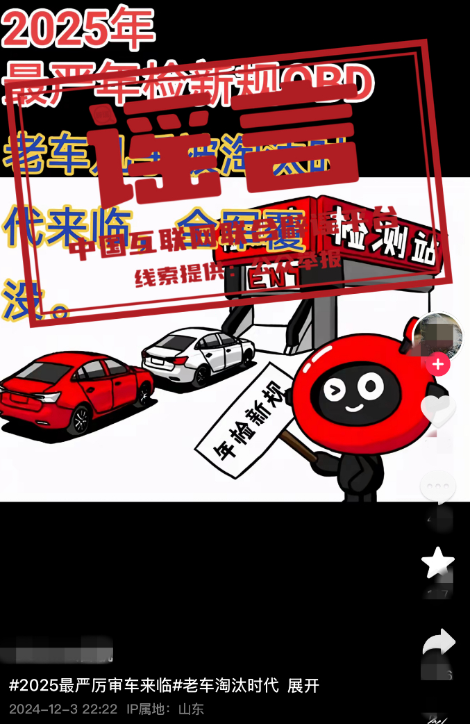 ??真相:近日,多個自媒體賬號發(fā)布消息,宣稱“史上最嚴(yán)車檢來了”“車檢年限變化”“燃油車年檢增加OBD檢測”等。中央廣電總臺中國之聲記者多方求證了解到,上述說法均為不實消息,目前各地車檢并沒有新變化。